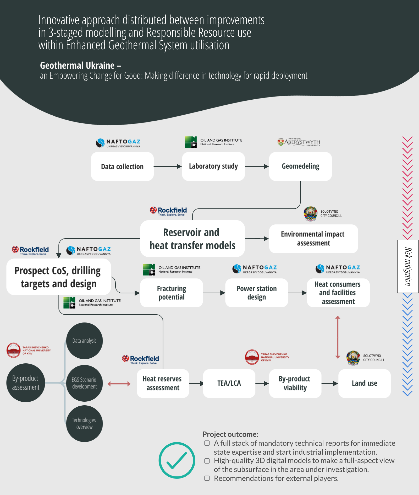 The main project outcome will be the development and deployment of innovative workflows for rapid, safe, responsibly resourced and environmentally sound technology for Enhanced Geothermal System (EGS) energy recovery in Ukraine. The Project will provide an innovative path to speed up geothermal exploration in Transcarpathian and wider regions of Ukraine.